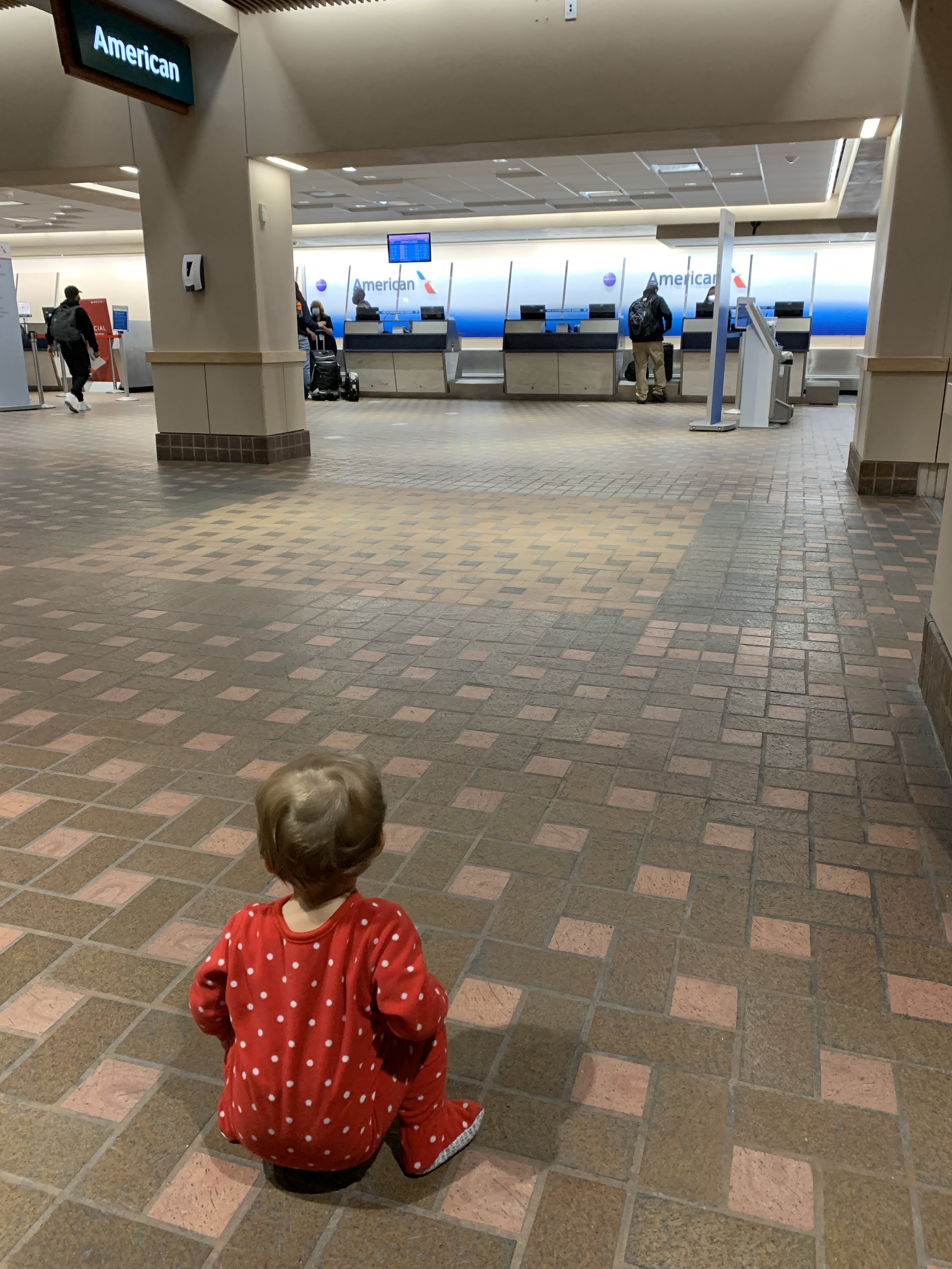 She got her "first set of wings" from the stewardess. Her favorite, though, was walking up and down the long corridors in the airports. She has never had that much inside open space to cruise around on her new walking feet. She loved it and went up and down and up and down. She also loved all the people. She would pass one person, turn to follow them and then another person would pass in the other direction and she would turn to follow them until she just decided to do her own thing. All in all, Quincey is a great traveler!